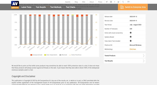 It recorded a relatively underwhelming result during AV-Comparatives.org’s real-world protection test for July-August 2023, posting a 98.4% blocked rate, lower than the industry average of 99.4%.